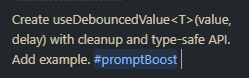 "Create useDebouncedValue<T>(value, delay) with cleanup and type-safe API. Add example."